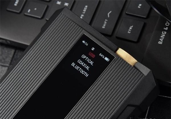 Q7的机身正面上半部分是一块1.3英寸的全彩小屏幕,可以展现以往看不到的音乐格式、采样率等信息,而下半部分则是HiFi发烧友们崇拜的信仰小金标,恩,这个绝对不能少~