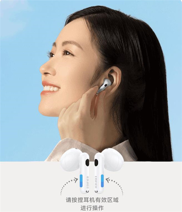 耳机柄上端椭圆形开窗表面有致密的黑色金属网覆盖,中间是漫步者品牌Logo,末端是金属触点充电;耳机柄侧边凹槽区域支持压感操控。