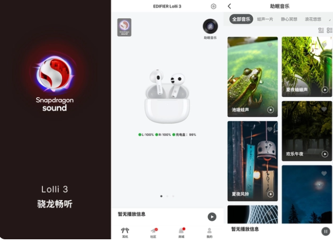 漫步者Lolli 3适配EDIFIER CONNECT APP,下载安装后即可添加绑定设备。连接成功后,APP会显示骁龙畅听弹窗,随后跳转到耳机页面,第一页会显示设备工作状态和剩余电量,右上角有助眠音乐资源区域。