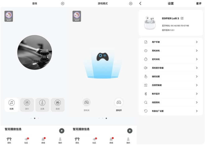 第二页可切换默认EQ,有经典、流行、古典和摇滚4款可选,满足不同音乐风格的听歌需求;第三页可以切换游戏模式,提供更低的延迟。