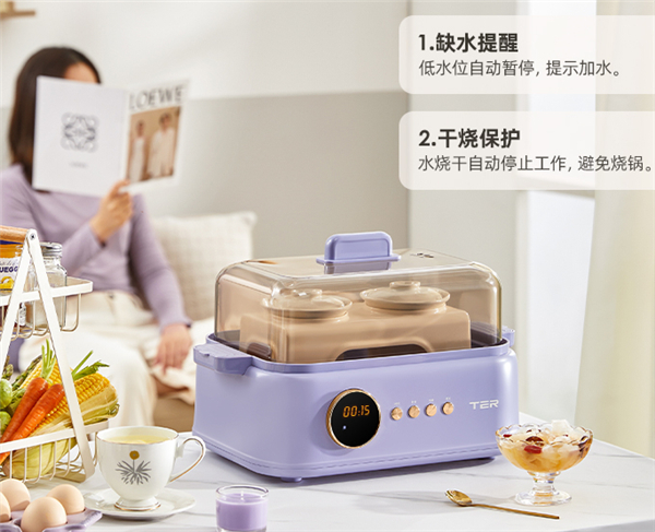 TER聚能鲜蒸锅T-ZG03颜值也是告别了老式蒸锅丑丑的外形, 有奶糖色和香芋紫两个颜色可选。满足蒸、炖、消毒、保温四大功能。一锅包揽一日五餐,拥有TER鲜蒸锅=双层蒸锅+双盅炖锅+消毒机+解冻机+焖饭煲,1台顶5台用。
