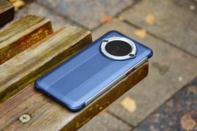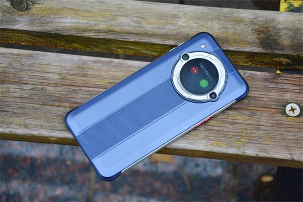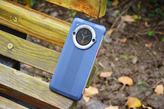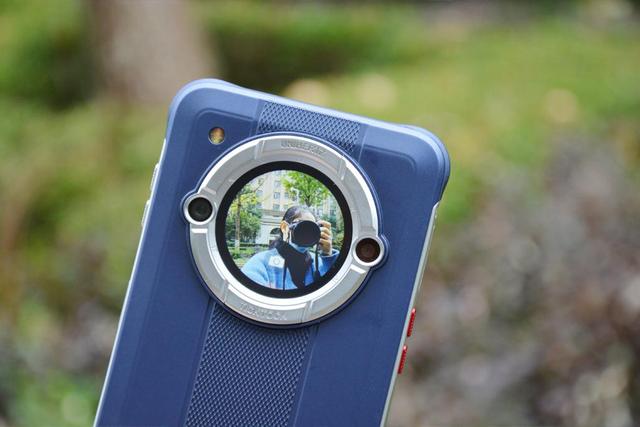 手机的背面也很亮眼,上方是类似手表的圆形副屏,左右两边巧妙的设计了两颗摄像头,左上角则是独立的闪光灯。整个后壳采用蓝色配色,居中对称设计了一条凹凸颗粒面,握持时能够起到一定的防滑作用。