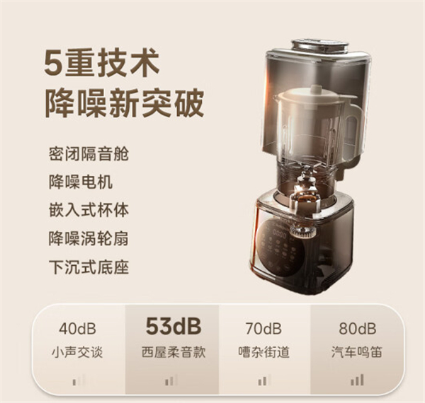 西屋轻音破壁机采用了五重降噪技术,工作最低分贝低至53db,最大限度的隔绝噪音,即使早晨使用也不会打扰到家人休息。