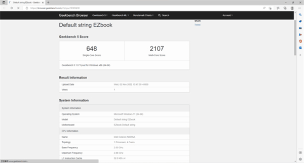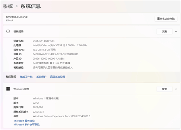 EZbookS5Pro作为中柏2022年最新推出的轻薄型笔记本产品,在性能配置方面给予了强有力的提升。从整机的系统信息中可以看到,我们拿到的这款评测的机型是英特尔第11代N5095A处理器、12GB内存,并预装了最新的Windows11家庭版的产品,均是主流配置,能够满足日常办公娱乐的主要需求。