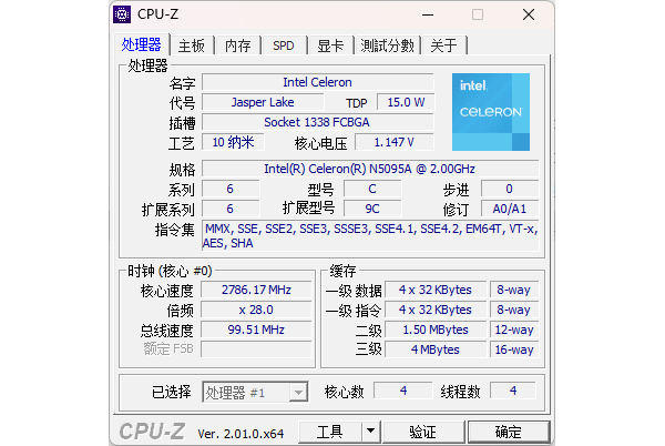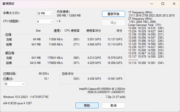 压缩与解压缩在日常办公应用中会频繁涉及,不只是打包与解包,几乎所有软件后台运行都会做压缩与解压缩的工作。通过7-Zip测试可以看到,完成10轮测试耗时仅98.938秒,总体评分为14.561GIPS,压缩与解压缩性能表现的还可以,毕竟N5095A处理器是4核心4线程设计。