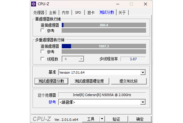 在CPU-Z性能测试标准中,其单核性能评分为260.4,多核性能评分为1007.3,从跑分测试可以看到,中柏EZbookS5 Pro性能调校相当出色,充分发挥出了这颗处理器的单核与多核性能。