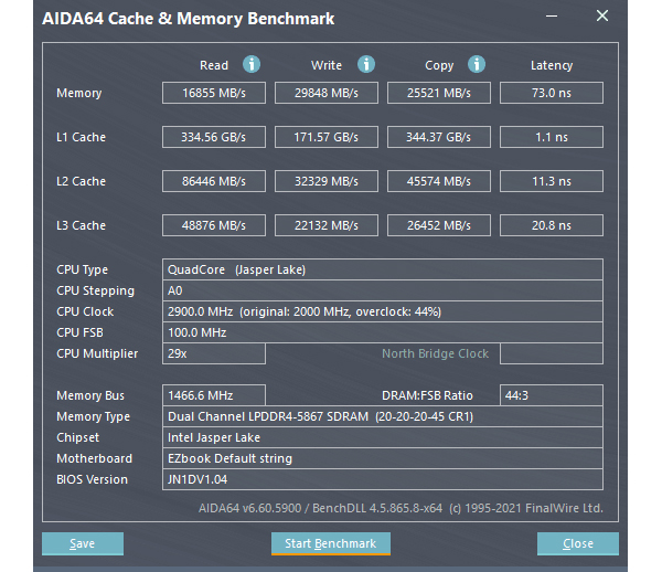 通过实测可以看到,中柏EZbookS5Pro的内存读取速度达到16855MB/s,写入速度29848MB/s,拷贝速度25521MB/s,延迟73.0ns,测试数据来看,由于采用了双通道的设计,数据传输更加快捷,还是非常给力的。