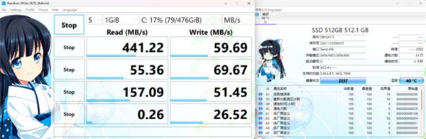 硬盘方面,中柏EZbookS5Pro搭载了512GB容量的SATA固态硬盘,实测其读取速度441.22MB/s,写入速度59.69MB/s,4K随机读取速度为0.26MB/s,写入速度为26.52MB/s,达到了SATA固态硬盘的标准性能水平。