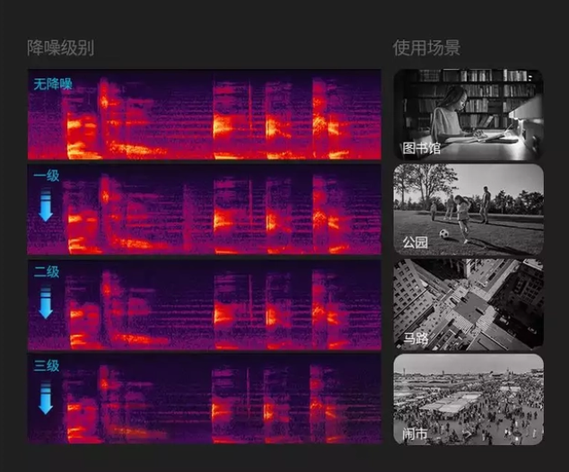 斯莫格Wave W1-C收音支持三级降噪,在图书馆等静谧场景下,可不开启降噪;一级降噪匹配公园等轻度嘈杂环境;二级降噪适用于马路等中度嘈杂环境;三级降噪则适用人声鼎沸的商场、体育场等环境。