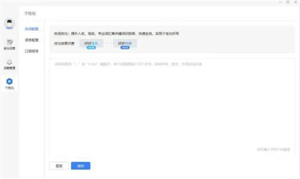 使用之前,还可以在个性化设置-热词配置中预先添加热词,提升人名、地名、专业词汇等关键词识别率,快速生效,实现个性化听写,可输入多达100个关键词。