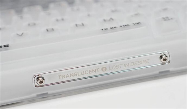 “TRANSPARENT LOST IN DESIRE”金属铭牌,透明在欲望中迷失,很文艺的一句话,我很喜欢,而且这块金属铭牌搭配不锈钢内六角螺丝,点缀在这把键盘上,完全不会有任何违和感。
