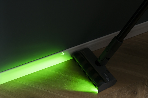 而追觅V16S提供了一个“看得见”的解决方案,在贴边软绒地刷上搭载了绿光显尘技术,在清洁的过程中,可以让地面的灰尘、颗粒垃圾显而易见,让灰尘无所遁形。一般家庭都会使用大理石、木地板等硬质地面材质,在绿光照射下十分明显,比传统白光照明更显眼,真正做到肉眼可见。