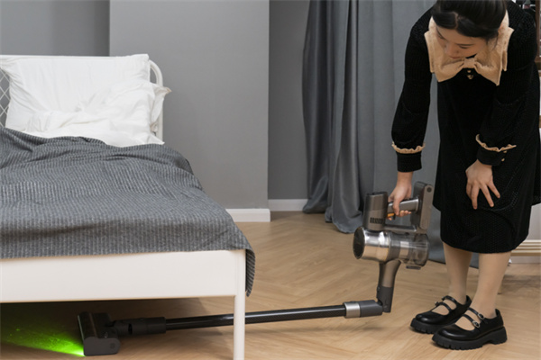 平时家里肯定会有像沙发、床、柜子等这样的低矮家具,大部分清洁工具的倾斜角度都比较有限,久而久之灰尘就会越积越多,造成清洁死角。为了解决这个难题,追觅V16S配备了一个可弯折的转接头,装上之后就能轻松清洁这些家具底部了。同时搭配绿光显尘技术,也能解决照明问题,打扫的时候再也不用尴尬地趴在地上了,这个小小的配件,就能解决大问题,我可太喜欢了。