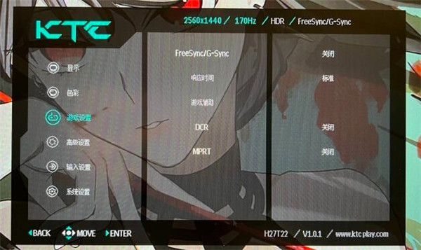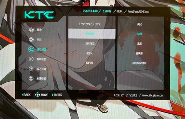 KTC的OSD中单独预留了游戏设置的一级菜单,打开之后可以看到FreeSync/G-sync、响应速度、游戏辅助、DCR、MPRT五个功能,可以在三级菜单看到二级菜单的状态,一目了然。KTC这一波OSD变化我是非常喜欢的。
