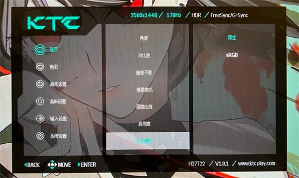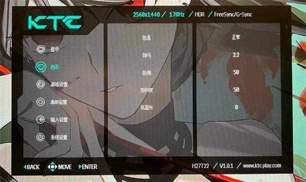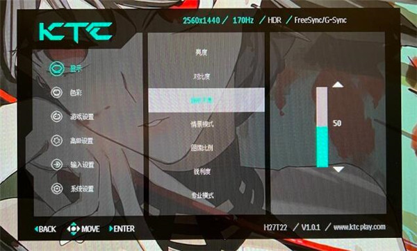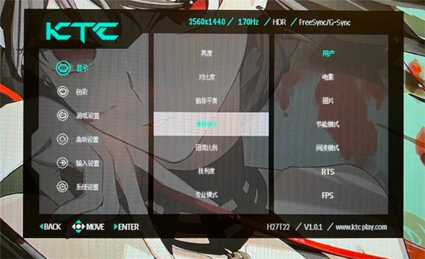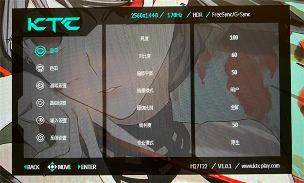 OSD设置KTC H27T22的OSD主界面在中间,可以调整颜色,周边一框黑色,选项部分是半透明,可以看到背后的壁纸。在那个菜单会显示蓝色,一级菜单有显示、色彩、游戏设置、高级设置、输入设置、系统设置。目前是在一级菜单,可以看到二级菜单的选项和对应状态,比如亮度是100、对比度60、暗部平衡50、情景模式用户等等。
