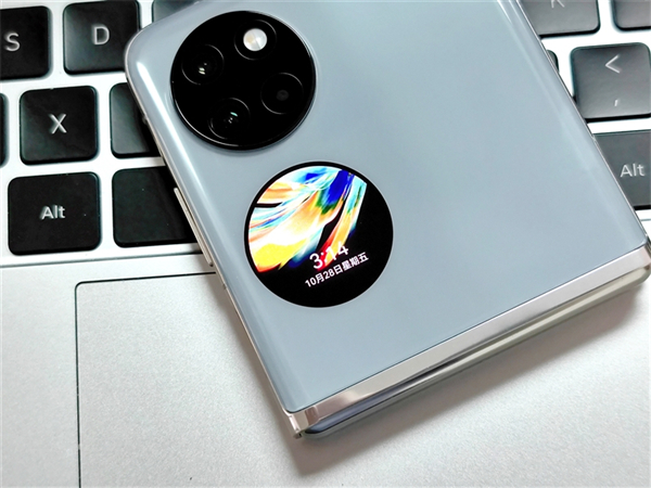 在相机下方拥有一块1.4英寸的圆形OLED显示屏,不仅可以用它来看时间,还可以实现自拍,控制音乐,展示健康码等等多种功能,并且屏幕的显示方向随着手机的转动而自动旋转。