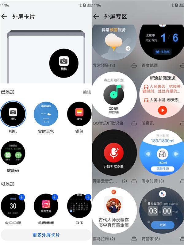 华为Pocket S的外屏不仅仅具备时间显示、自定义主题等功能,还内置了播放音乐、天气、镜子以及相机4种使用功能,并可进行设置添加更多实用的小程序,例如利用后置镜头自拍、显示健康码、地图导航、QQ音乐以及喜马拉雅FM等多种功能。