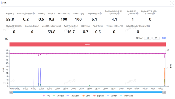 首先是《王者荣耀》手游,开启高帧率+超高分辨率,游戏以最高60FPS运行,经过一句团战近10分钟的游戏,可以看到帧率曲线非常平稳,在游戏过程中无任何掉帧情况,最终的平均帧率维持在59.8FPS,几乎满帧率运行。