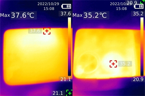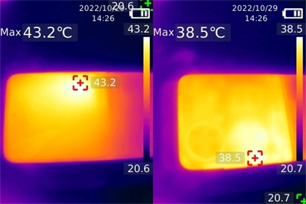 温度方面,经过10分钟的游戏,机身正面最高温度43.2摄氏度,背面最高温度38.5摄氏度。