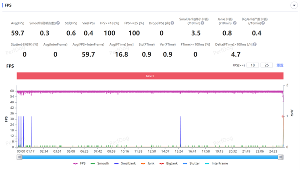 接着是《和平精英》手游,开启流畅画质+极限帧率下,经过一局游戏近25分钟的测试,游戏帧率依然稳如一条直线,游戏过程中画面连贯流畅,最终的平均帧率维持在59.7FPS。