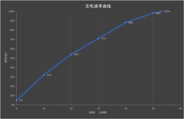 我们从5%开始测试充电,10分钟充至32%,20分钟充至54%,半小时充至71%,完全充满用时53分钟。