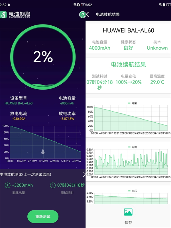 我们使用电池狗狗对华为Pocket S进行续航测试,将手机亮度调整为50%并关闭自动亮度,刷新率默认为智能切换,从100%电量开始测至20%,最终跑出了近7小时4分钟的续航成绩,经过折算,满电续航可以达到近8.5个小时左右,与常规的直屏手机相差无几。