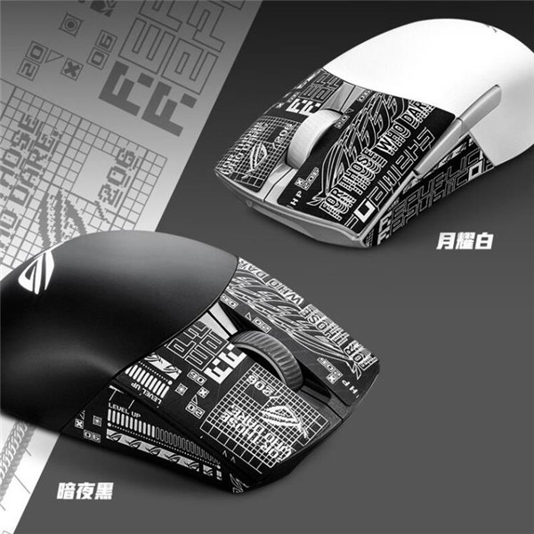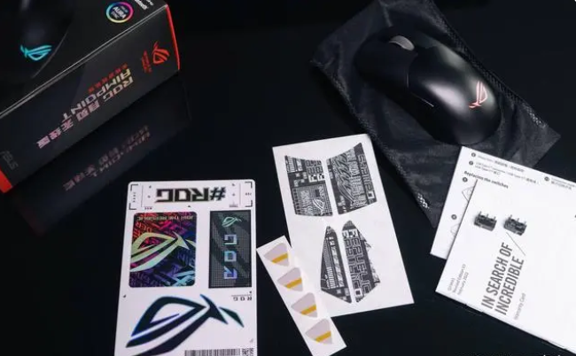 包装的第二层,除了一大堆说明和信仰贴纸外,还随包附赠了4个脚垫,2个热拔插微动以及一套防滑贴。这套防滑贴的颜值还是很高的,ROG一贯的花字风格。