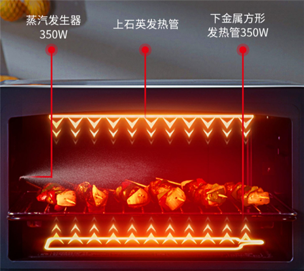 东芝微蒸烤一体机SD80顶部内置的石英发热管,当蒸汽遇到发热管,能迅速升温至250℃,用超高温水蒸汽包裹食物,能帮助析出多余油脂,细化水分子,令口感更有层次感,吃起来也更健康,可以使用此功能制作烤肉串、烤鱼、烤生蚝。