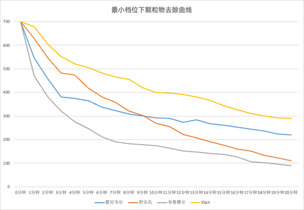 最小档位下颗粒物去除成绩曲线图如上。在最小档位下,布鲁雅尔第一,舒乐氏第二,霍尼韦尔第三、IQair第四。