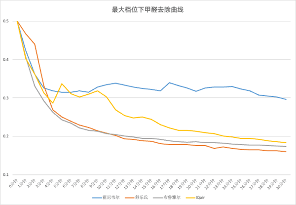 霍尼韦尔最小档位下风量过小的缺点,让其在长达30分钟的测试过程中无法将甲醛降低到0.3以下。其他三款虽然净化速度普遍比较慢,但还是显著净化了室内甲醛!