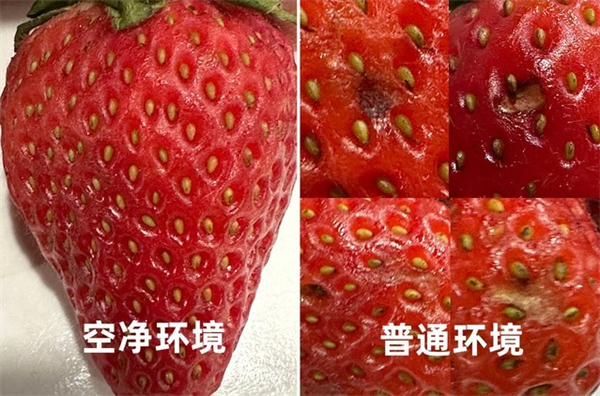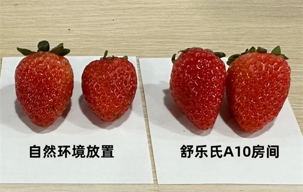 我将清洗干净的草莓分成分组,一组放置在摆放了舒乐氏A10房间里并启动空气净化器,另一组放置在空气自然流通的开放环境中,静置两天观察草莓的外观变化,结果如下图。