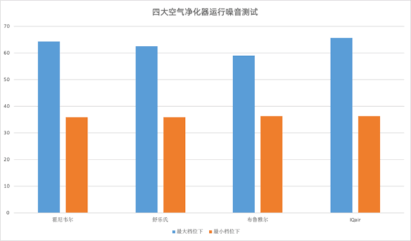 其实,四款产品在噪音方面的表现几乎相同。最小档位下的运行噪音基本与环境音相同,可以忽略不计。而最大噪音都在66分贝以下,布鲁雅尔以59分贝小胜一筹。其实大家大可不必为四款产品的噪音而担忧,毕竟这四款产品都有睡眠模式或自动模式,哪怕是夜间使用也无需担心它们“吵”到你。