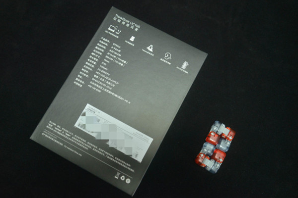 ThinkBook UC100蓝牙耳机包装盒采用了联想周边设备惯用的黑色包装设计,妥妥的商务风,简洁大气。包装盒右上角是是标志性的“LENOVO”品牌logo,正中位置则是耳机的渲染图片,各个细节渲染的非常到位。