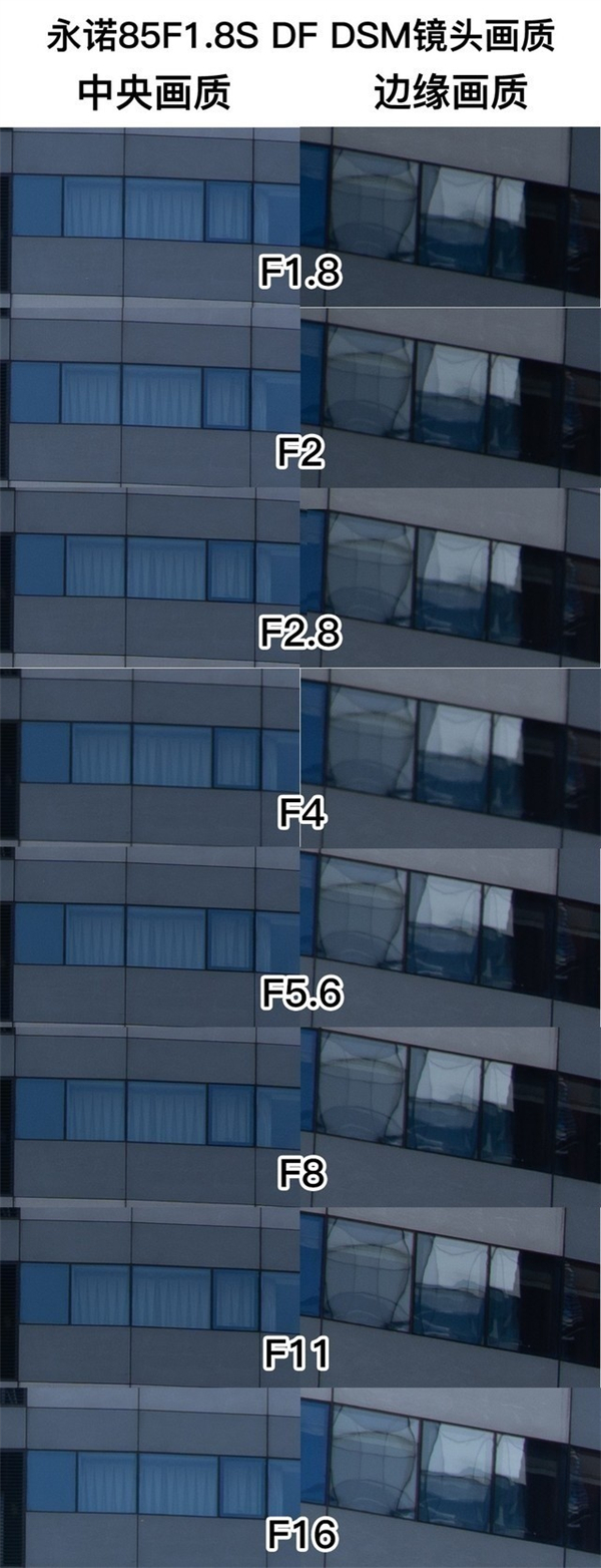 在中央画面部分,永诺85F1.8S DF DSM镜头的画质表现非常优秀,最大光圈F1.8的画质比较不错,可以放心使用。从F2开始一直到F11光圈,画质都十分优秀,并且具有非常出色的锐度表现。F16光圈下画质开始下降,但依然可用。也就是中央画质部分,镜头的全段光圈都可以放心使用。
