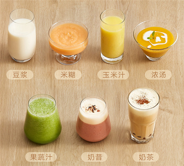 旋转旋钮可以在7个预设菜单间切换,豆浆、米糊、玉米汁、浓汤、果蔬汁、奶昔、奶茶,可以制作各种冷饮和热饮。破壁、搅拌、碎冰、榨汁均可完成,满足多种需求。