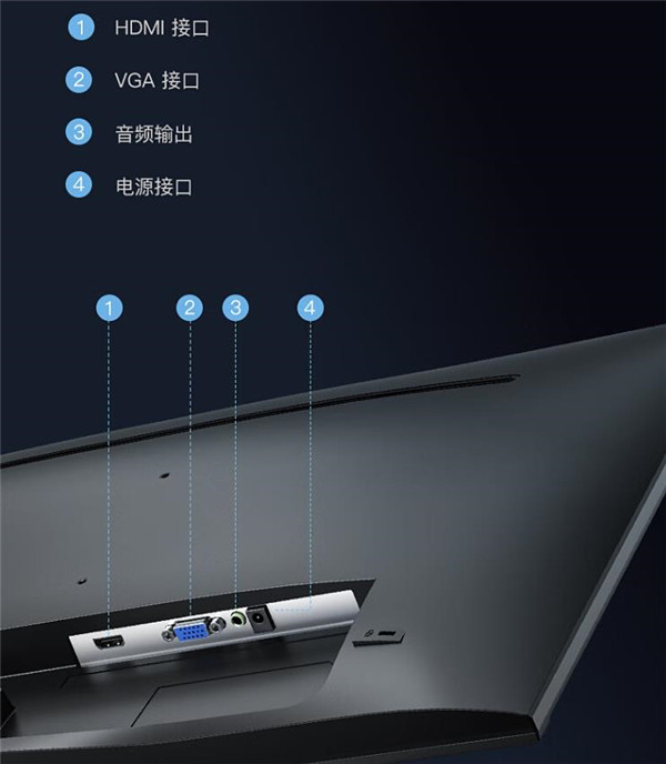 在接口方面只预留了办公常用的HDMI接口、传统的 VGA接口(说实话这个倒是很少见到了)音频输出(因为没有内置音响)以及电源输入接口。
