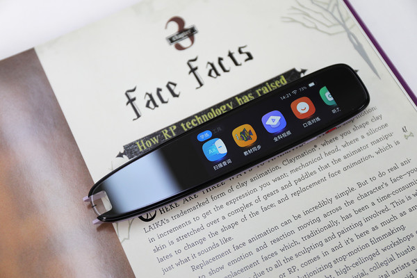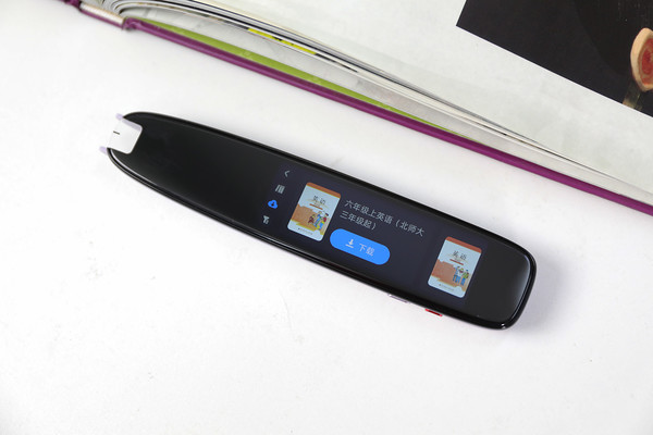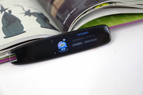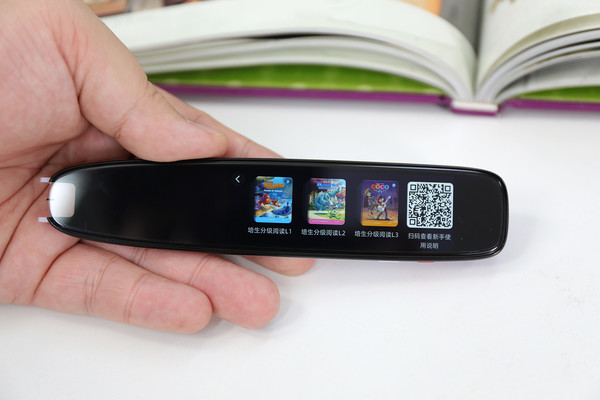 首先,作为一台面向学生的产品,在外观上就要有更高的要求,如布AI词典笔V11整体上依旧保持了“笔”的形态,由笔身、屏幕、扫描光头三个主要部分组成,规格为 147*31*13mm,重量为71g,在同类产品中属于小巧轻便型的设计,握持在手中的感觉与一支笔无异样。最引人注目的,自然是贯穿笔身的这块2.99英寸的高清触摸屏,这块屏幕在感官上有着不输手机的体验,细节清晰,颜色柔和,亮度根据需要进行调节。最重要的是,它系统内的字体也合适,距离较远也能清晰地看到,能够有效地保护孩子的用眼健康。