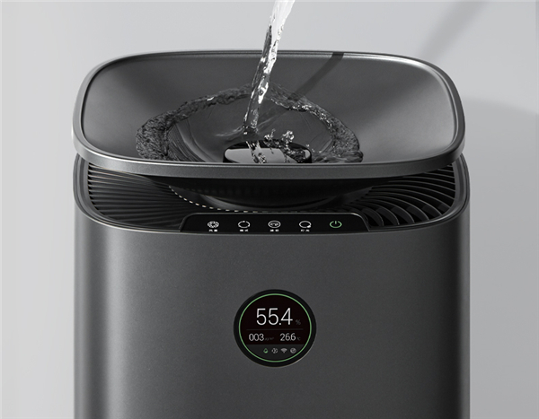 352 H300加湿净化一体机支持两种加水方式,可以把下面的水箱拿出来加水,也可以直接向上方的水盘倒水。顶部使用了仿荷叶纳米疏水材质,水珠直接就滚到内部了,水盘残留水痕更少,加水十分流畅干净,治愈强迫症。