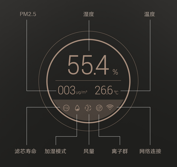 352 H300加湿净化一体机的操控界面也很高级,给大家看看高清LED屏,支持智能数显,可以显示室内温度、湿度以及pm2.5数值的实时显示,很方便我们对产品工作效率和效果进行检查,还会显示滤芯状态、加湿净化、模式/风量、联网状态以及离子群等,不仅好看,还十分的好用。