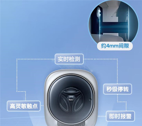 海尔壁挂洗衣机安装后,机器背部智能感应开关会与墙体贴合,感知机器与墙体状态,当机器与墙体距离发生异常变化时,判定机器发生安装松动,停止洗衣机运转并发出报警。