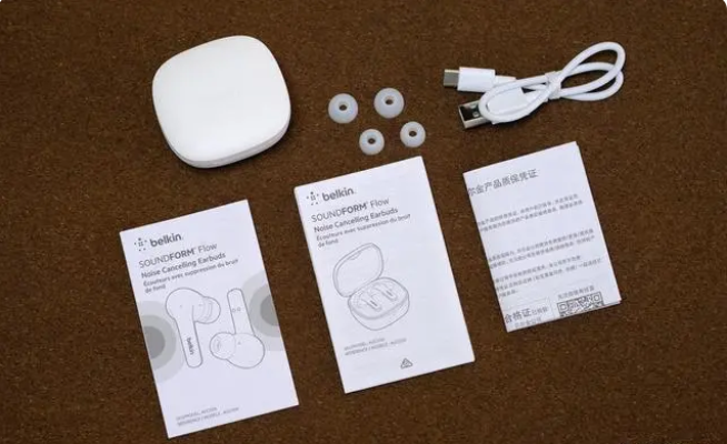 贝尔金SOUNDFORM Flow的包装盒很小巧,但设计很精致,贝尔金的老用户应该很熟悉这样的味道了,配色过于艳丽。盒子里的物件有贝尔金SOUNDFORM Flow、大中小三对耳套、充电线、说明书。
