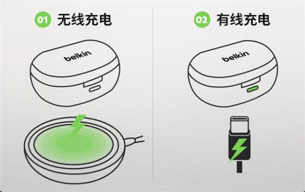 盒身的背面设有USB-C充电接口,只需要2小时就可以让耳机和充电盒的电量充满。belkin SOUNDFORM Flow耳机可播放时间约7个小时,充电盒能带来额外24小时的续航,所以复合续航时间可长达31小时,完全能够满足多数人的使用需求。