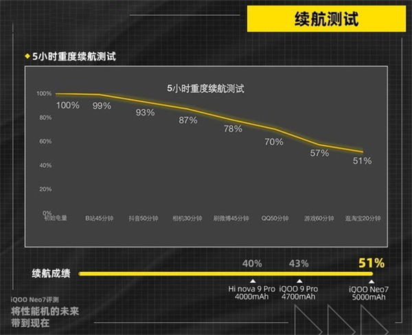 以上就是来自iQOO Neo7的续航性能实测。总体来说,iQOO Neo7的续航、充电、性能都十分出色,无论是日常使用,还是游戏重度用户都能满足需求。