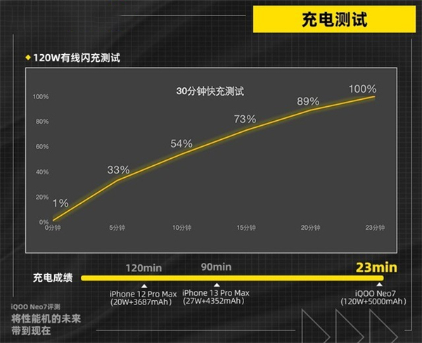 充电方面,120W超快闪充依旧没悬念。根据实测,iQOO Neo7在23分钟内可将电量从1%充至100%,15分钟即可充至73%电量,在5000mAh大电池的手机中,iQOO Neo7的充电速度是非常可观的,相信这在日常使用中会极大提升我们体验。