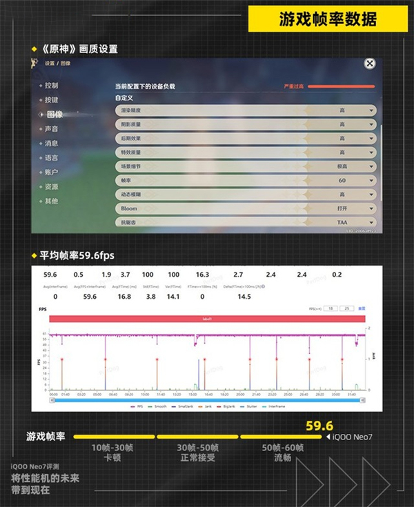 在《原神》 (高画质+60帧)30分钟测试中设定下,笔者绕着蒙德城跑图,iQOO Neo7的平均帧率达到了59.6fps,仅在部分场景下出现了小幅波动,整体游戏体验十分流畅,游戏体验还是不错的。