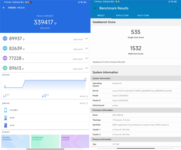 安兔兔34万分左右,Geekbench 5单核得分535,多核得分1532,大家看惯了旗舰机,也习惯了用《原神》当作性能的评判标准,是不是很久没见到这种级别的分数了。其实,有不少用户日常使用平板就是追剧,对于性能的需求并不高。