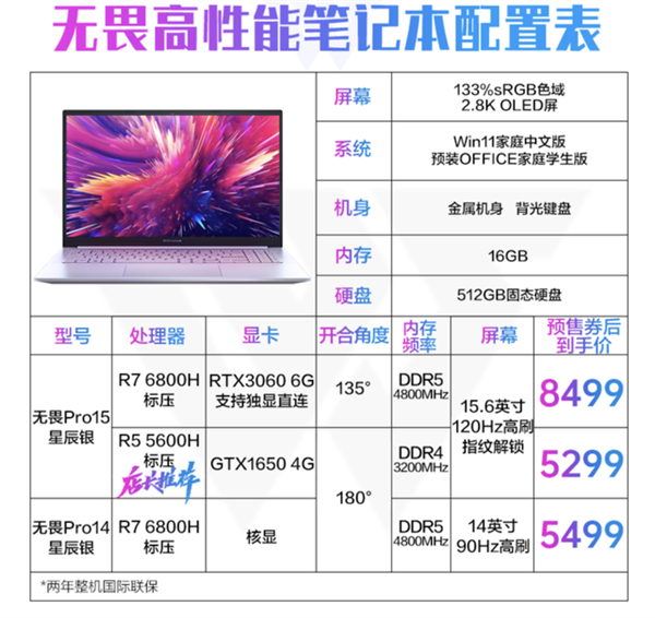 除了锐龙 7 6800H+RTX 3060 的配置版本之外,无畏Pro15 还有锐龙 7 6800H 集显版和锐龙 5 5600H 版本可选,与之搭配的是 GTX 1650 显卡;屏幕同样为 15.6 英寸 OLED 120Hz 高刷屏,具体配置、价格信息如下,感兴趣的小伙伴不妨关注一下。