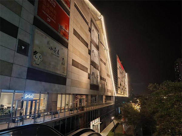不过需要注意的是,在开启【超清】模式拍摄照片时,拍摄无法进行 AI 优化或者激发 HDR 模式,导致手机照片可能存在一些过曝等情况,这点在拍摄夜景时会比较明显。比如下面这张照片,在建筑物的发光灯带以及发光字体,超清的高像素样张便缺失了高光的压制处理,而默认的拍摄模式则对高光处进行了优化处理。
