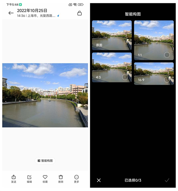而在相册中,所拍摄的 5000 万像素以及 2 亿像素的照片,会出现一个 " 智能构图 " 的选项,点击智能构图,会自动生成 1:1、4:3、16:9 等构图方式的裁切照片,选择自己认为好看的那张,可以直接使用。