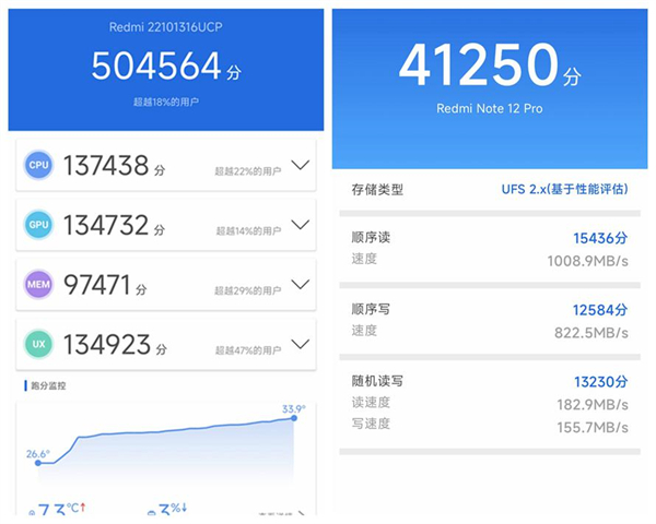 在安兔兔获得 50 万分,存储的顺序读取速度为 1008.9MB/s,顺序写入速度为 822.5MB/s,Redmi Note 12 Pro+ 采用的是 UFS2.2 闪存,以及 LPDDR4x 内存,手上这款采用的是 12GB+256GB 存储规格。